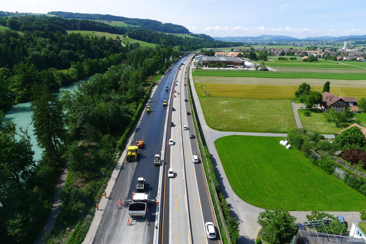 Die Arbeiten zur Erneuerung der A6 zwischen Rubigen und Kiesen schreiten trotz regenreichem Frühling plangemäss voran. Vom Abschnitt Niederwichtrach bis Kiesen ist die Erneuerung der Fahrbahn in Richtung Thun weitgehend abgeschlossen. Nun folgt die Erneuerung der Fahrbahn in Richtung Bern.