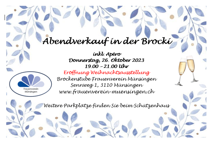 Abendverkauf in der Brocki vom Frauenverein Münsingen inkl. Apéro. Zudem Eröffnung der Weihnachtsausstellung.