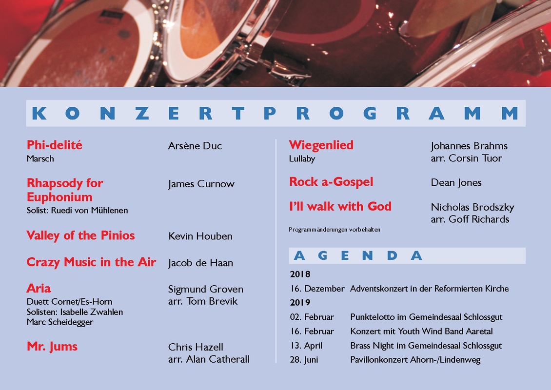 Die BBM entführt Sie auch in diesem Jahr in die abwechslungsreiche Welt der Brass Band Musik. Mit traditionellen Rhythmen werden wir das Konzert eröffnen. Gefolgt von solistischen Werken, Klängen griechischer Landschaften und bekannten Melodien endet das Programm in Besinnlichkeit.
