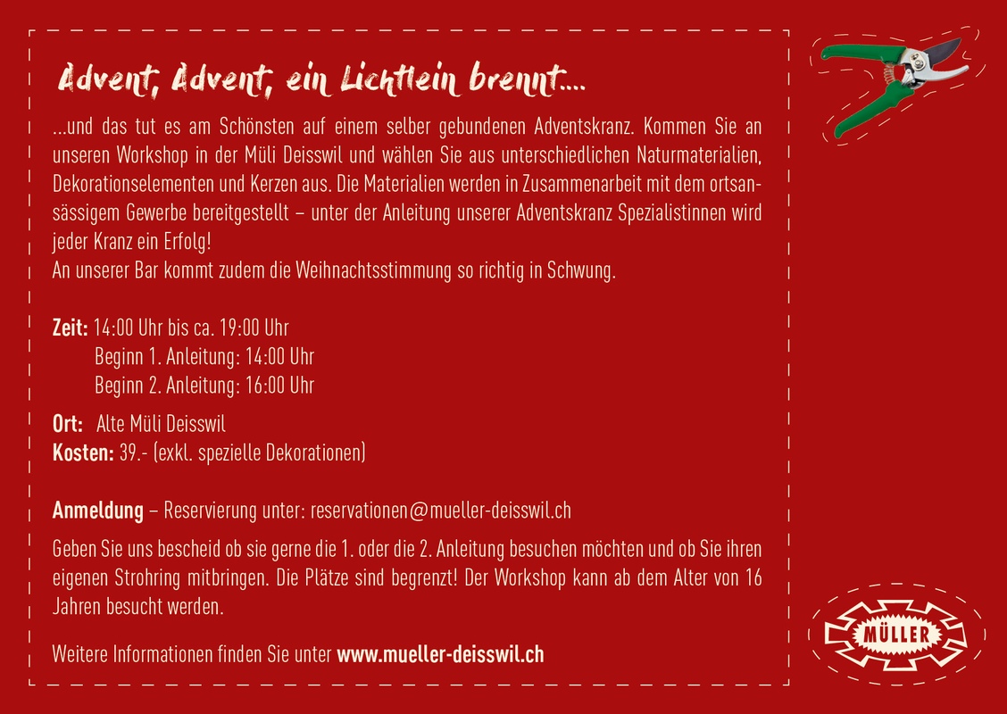 Reservieren Sie sich Ihren Workshop-Platz per Mail an reservationen@mueller-deisswil.ch.