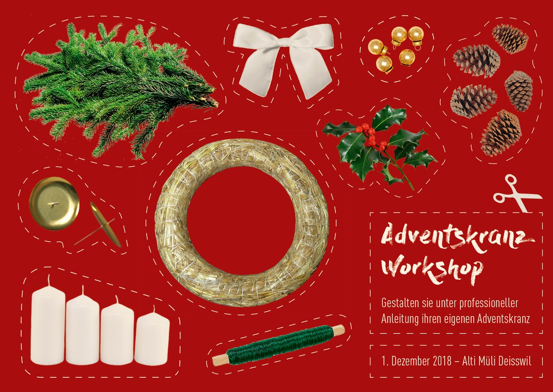 ...und das tut es am schönsten auf einem selbst gebundenen Adventskranz. Stimmen Sie sich bei uns so richtig auf die Weihnachtszeit ein und gestalten Sie einen Adventskranz ganz nach Ihren Wünschen. Unter fachkundiger Leitung gestalten Sie von Grund auf einen Adventskranz. Wählen Sie aus unterschiedlichen Naturmaterialien, Dekorationselementen und Kerzen aus und lassen Sie Ihrer Kreativität freien Lauf. Die Materialien werden in Zusammenarbeit mit dem ortsansässigen Gewerbe (Glaswerkstatt, Schulthess Kerzen) und den Pfadfindern der Pfadi Mülistei bereitgestellt.