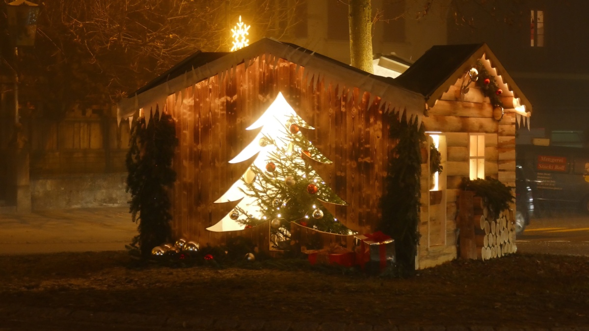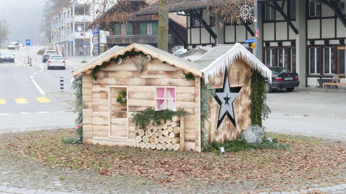 Beim Umfahren des Dorfkreisels in Boll ist er nicht zu übersehen: Der aktuelle Kreiselschmuck in Form einer gemütlichen Alphütte mit Holzstapel und Vorhängen, bis ins letzte Detail geschmückt. Sogar Gschänkpäckli, ein grosser Stern, Weihnachtsbaum und Hirschgeweih fehlen nicht. Bei Nacht wird das Hüttli feierlich beleuchtet.