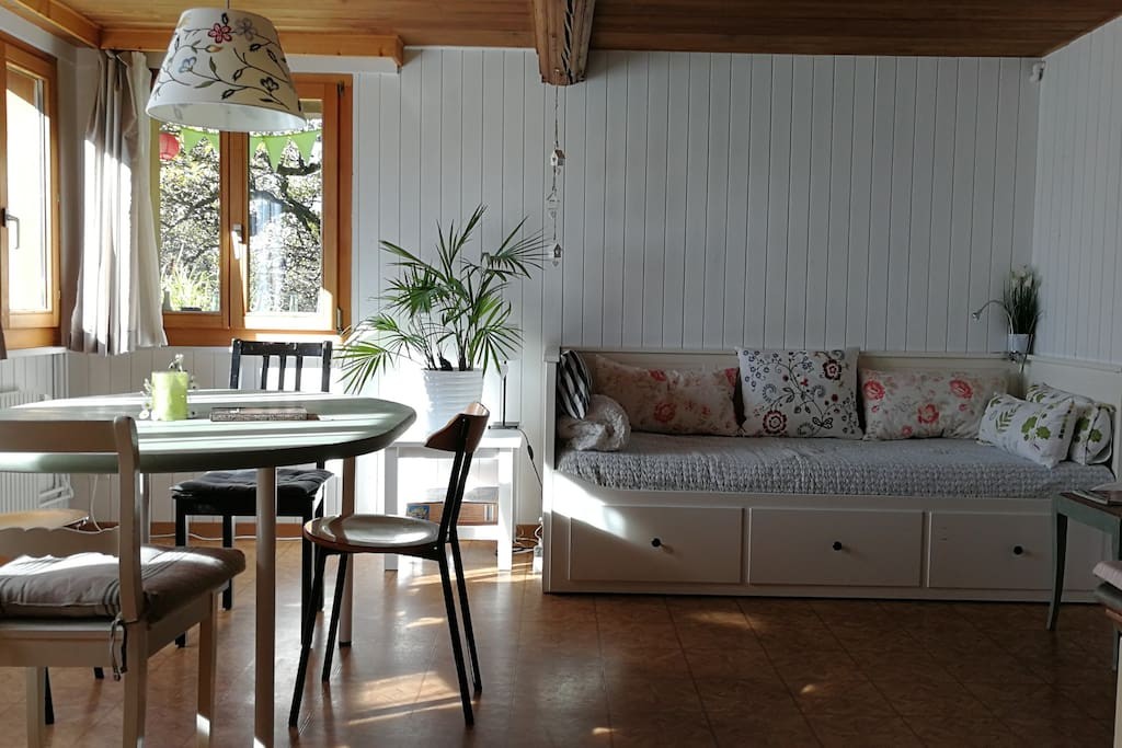 Das Studio auf dem Biohof Trimstein ist zwar eher einfach eingerichtet, dafür locken draussen die vielen Hoftiere und eine traumhafte Aussicht über die grünen Wiesen zur Alpenkette.