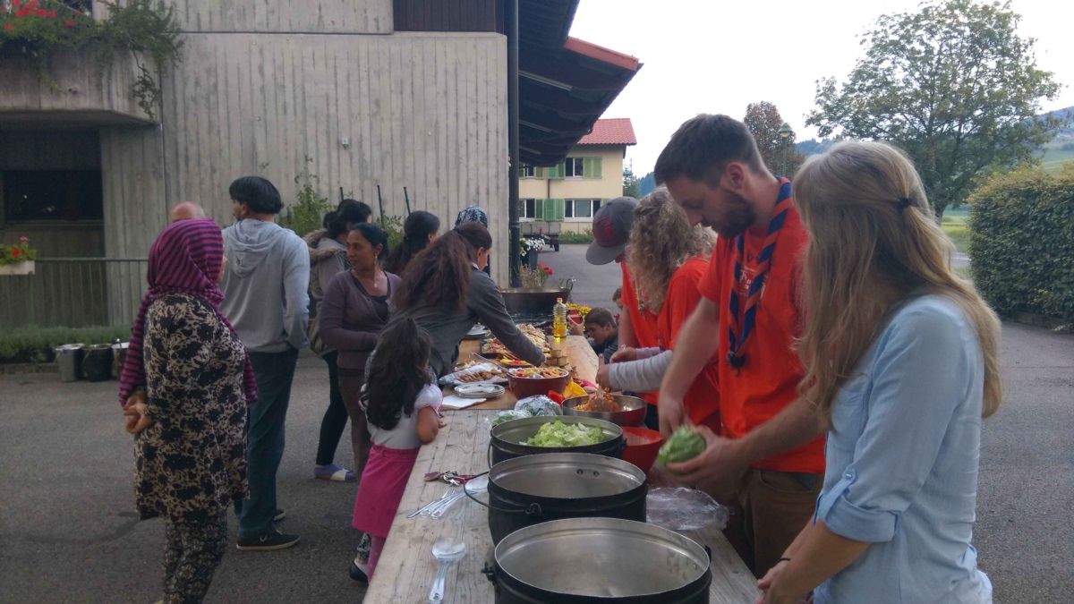 Zum Abendessen begaben sich die Kinder und Jugendlichen der Pfadi und der Jungschar zum Asylzentrum, wo sie einen gemeinsamen Abend mit den Bewohnern vorbereiteten. "Wir kochten Älplermagronen und drei Frauen des Asylzentrums kochten und backten Spezialitäten ihres Landes", beschreibt Manuel Meyer, Abteilungsleiter der Pfadi Kuonolf. Später durften die Kinder das Asylzentrum von Innen betrachten, während eine Frau über Ihre Flucht aus Afghanistan erzählte.