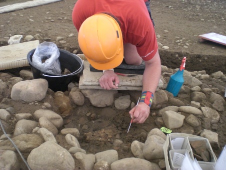 Überraschenderweise wurde auch ein römisches Körpergrab entdeckt. Am ausgesprochen schlecht erhaltenen Skelett liess sich das Geschlecht der oder des erwachsenen Toten nicht mehr bestimmen. Zwischen den Unterschenkeln der in gestreckter Rückenlage bestatteten Person lagen als Reste einer Grabbeigabe eine Ansammlung von verrosteten Eisenteilen, darunter viele Ziernägel. Vielleicht handelte es sich dabei um eine Ledertasche oder einen Gürtel.
