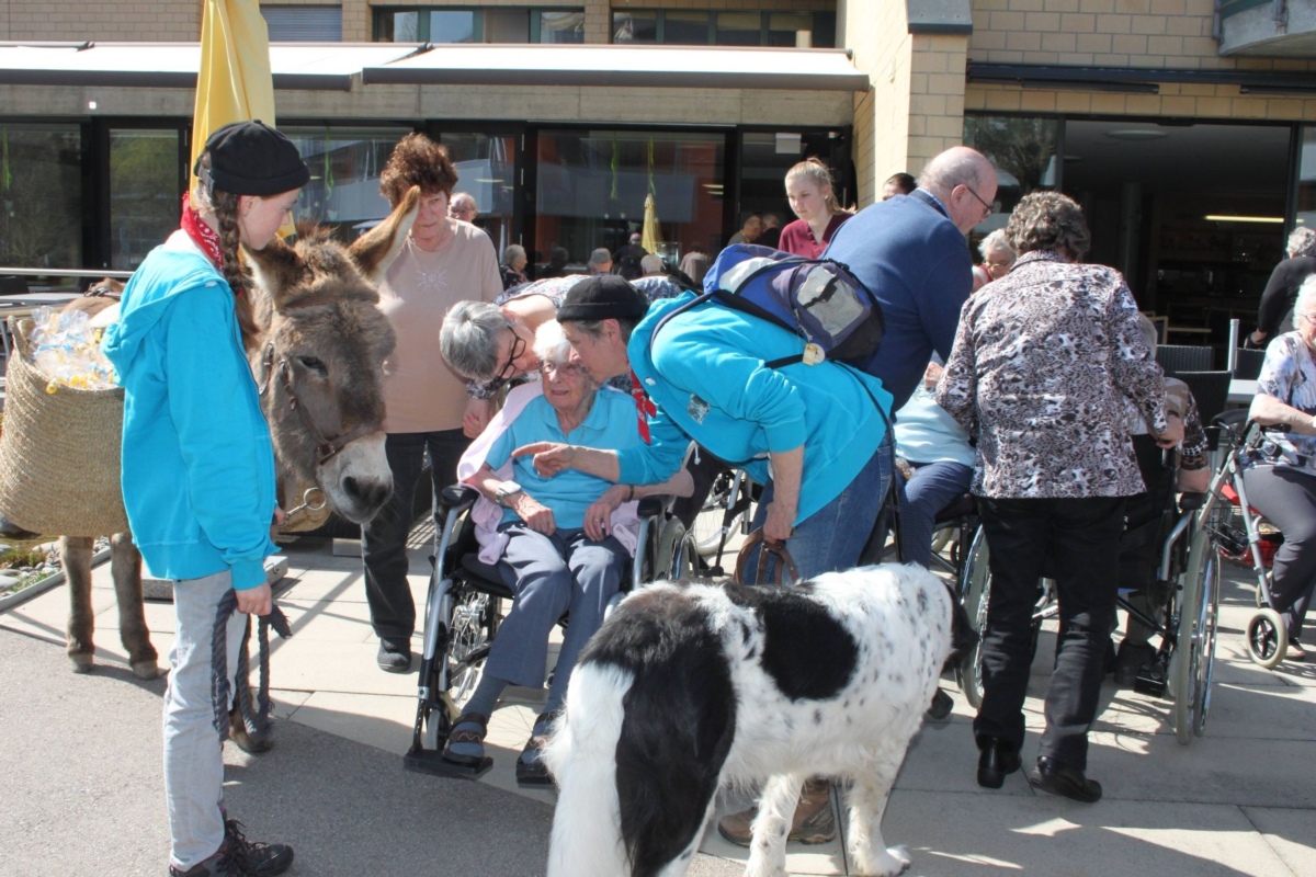 Viel Freude bereitete dann die wahrhafte Überraschung vor der Cafeteria. Die zwei Esel Sancho und Tobias mit ihrem Begleithund überbrachten ein kleines Geschenk aus Bremen. Und wies zu Geschichte passt, auch der Räubertee fehlte nicht. Dieser Anlass endete, wie jedes Märchen, mit dem Freudigen, Guten und Kostbaren, das lange in Erinnerung bleibt.