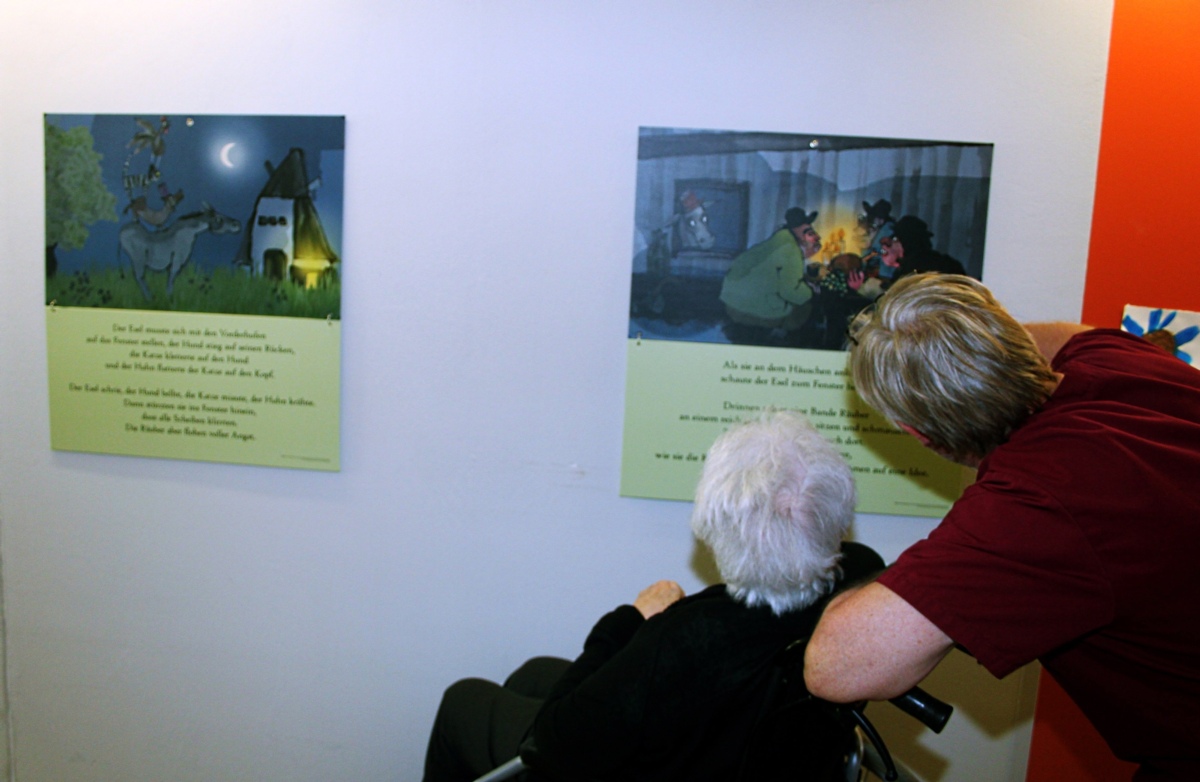 Das achtteilige Bilderset der Bremer Stadtmusikanten ziert nun den Flur- und Therapieweg im vierten Stock des Altersheims. «Die Bildergeschichten sollen anregen, Erinnerungen wachrufen und Gespräche auslösen. Die Märchen sind auch für demenziell erkrankte Bewohner bestens geeignet», erklärt die Leiterin.