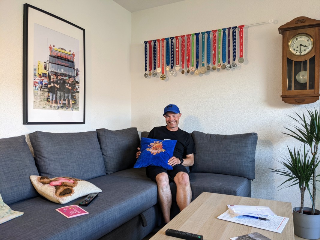 Es klappte mit den eigenen vier Wänden. Heimo lebt nun in einer 2.5-Zimmerwohnung zehn Minuten zu Fuss vom Hauptstandort entfernt. "In der eigenen Wohnung zu leben, bedeutet für mich Freiheit", sagt Heimo. Mit der Unterstützung seines Coachs richtete er die Wohnung ein. "Es ist alles durchgestylt", sagt Heimo mit einem breiten Grinsen. Das Wohnzimmer schmücken seine Pokale und Medaillen von Unihockey-Turnieren und Läufen. Sofa, Esstisch, Balkon und die grössere Küche bieten Platz, auch mal Gäste zu empfangen. Und das passiert auch. Heimos nächstes Ziel ist der Jungfraumarathon, an dem er zum dritten Mal teilnehmen wird. Einmal wöchentlich kocht er nach dem Training mit seinem Trainingspartner und Vater seines Göttibubs und dessen Frau nun gemeinsam bei sich zuhause und hat so regelmässig Besuch. "Das ging vorher nicht. Im Studio hatte es dafür keinen Platz", sagt Heimo.