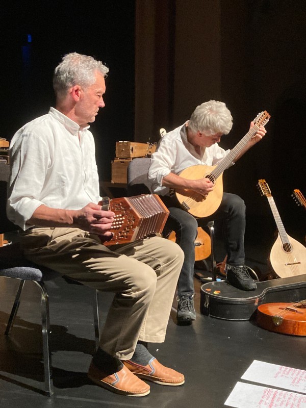 "Hanottere" ist der emmentalische Name für die sogenannte Halszither, das Modeinstrument der ländlichen Bevölkerung im frühen 19. Jahrhundert. Das gleichnamige Duo besteht aus den Emmentalern Lorenz Mühlemann und Thomas Keller. Beide packen für das Konzert am Sonntag eine ganze Reihe an Instrumenten ein, von der Hanottere bis zum Häxeschit. Gespielt wird "Volksmusik aus dem Alpenraum und darüber hinaus, Altes und Neues, von zart-besinnlich bis fröhlich-pulstreibend." Die Melodien stammen aus uralten Notenbüchern (Oberthal, um 1830), aber auch aus der Feder von Lorenz Mühlemann. "U de no Musig us em Ämmitau, vo z‘hingerscht us de Chräche u z‘höchscht vo de Höger", so heisst es in der Selbstbeschreibung der Musiker.