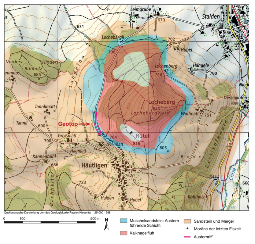 Austern und Miesmuscheln in Häutligen? Ja, tatsächlich. Allerdings ist das schon eine Weile her: Vor 18 Millionen Jahren, als die Region Bern noch von Meer bedeckt war, entstand hier das einzige bekannte, fossile Austernriff der Schweiz. Wahrscheinlich befand sich in der Nähe ein Mangrovenwald und die Temperaturen waren tropisch, so wie heute auf den Bahamas.