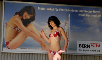 Die Plakate mit Miss BERN-OST - eine Kreation der Worber Werbeagentur Fruitcake - sind ab sofort und bis Mitte September im Schwimmbad Worb zu sehen (beim Badi-Restaurant). Plakate in den anderen Schwimmbädern der Region sollen folgen. Weiter wirbt Martina ab heute Montag für zwei Wochen an der Burgdorfstrasse in Konolfingen und bei der Bahnhofmatte in Rubigen. Ab 11. Juni werden die Plakate für eine Woche beim Bahnhof Münsingen und vis-à-vis der Migros Worb zu sehen sein.
