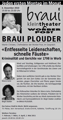Der Rüfenachter Historiker Dr. Marco Jorio, Chefredaktor des Historischen Lexikons der Schweiz, Präsident der IG Worber Geschichte,und die aus Worb stammende Historikerin und Gymnasiallehrerin Dr. Birgit Stalder erzählen im BRAUI PLOUDER.