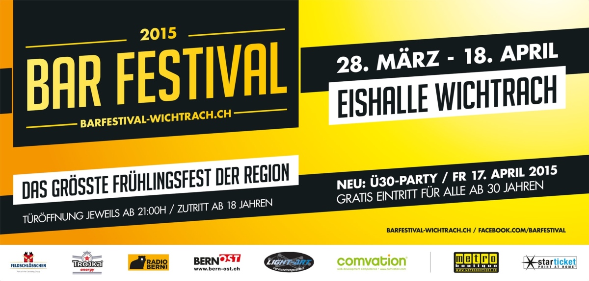 Vom 28. März bis 18. April 2015 findet an 4 Wochenenden um Ostern das Bar Festival in der Eishalle Wichtrach statt. Das Festival findet mittlerweile zum 16. Mal statt und ist mit den Jahren zum grössten Frühlingsfest zwischen Bern und Thun und somit einem etablierten Event in regionale Veranstaltungskalender herangewachsen. Das Grundkonzept hat sich seit der Gründung im Jahr 2000 praktisch nicht verändert: Bis zu 30 aufwändig und liebevoll gestaltete Bars & Stände, die allesamt von regionalen Vereinen, Institutionen oder Gastronomiebetrieben geführt werden und ein attraktives Musikprogramm mit DJs und Show-Acts bieten den bis 20'000 Besucher ein einzigartiges Festerlebnis und einen belebten Treffpunkt. Am 17. April findet auf Grund der grossen Nachfrage in den letzten Jahren zum ersten mal eine Ü30-Party statt: Das heisst für alle ab 30 Jahren ist der Eintritt an diesem Abend kostenlos und auch musikalisch stehen 80er, 90er, 2000er, aber auch aktuelle Charts auf dem Programm. Ansonsten gilt für den Zutritt zum Festival ein generelles Mindestalter von 18 Jahren. Das Festival ist jeweils von 21:00h bis 03:30 geöffnet. Für die Anreise werden die öffentlichen Verkehrsmittel empfohlen. Die Eishalle liegt nur wenige Fussminuten vom Bahnhof Wichtrach (S-Bahn S1) entfernt. Ab 01:30 verkehren kostenlose Shuttlebusse nach Bern und Thun. Für den Individualverkehr steht ein Festival-Parkplatz zur kostenlosen Benutzung zur Verfügung.