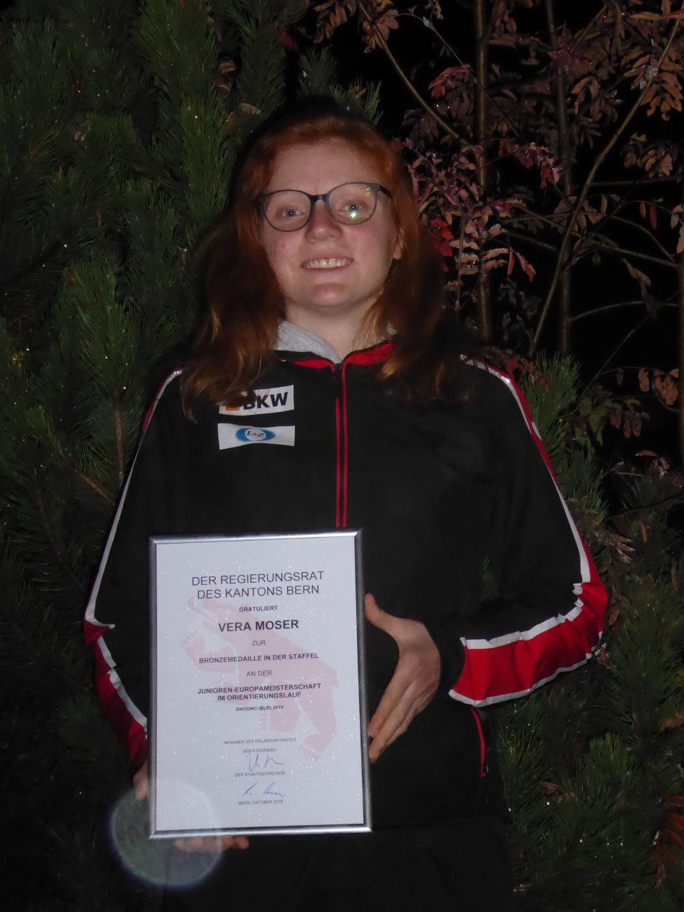 "Zuerst war ich etwas geschockt", sagt Vera Moser. Sie ahnte noch nichts vom Inhalt, als eines Tages ein Brief der Polizei- und Militärdirektion in ihr Haus in Konolfingen flatterte. Es folgte Verwirrung und schliesslich Freude nachdem die 17-Jährige das Couvert öffnete. Die Orienierungsläuferin wurde für ihre ausserordentlichen sportlichen Leistungen mit dem Berner Sportpreis ausgezeichnet. Am Montag fand die Preisverleihung im Ratshaus Bern statt. Insgesamt wurden 69 Sportlerinnen und Sportler aus dem Kanton geehrt. Vera Moser war in prominenter Gesellschaft. Darunter waren zum Beispiel Schwingerkönig Christian Stucki, die Leichtathletin Delia Sclabas und verschiedene Mitglieder der Unihockey-Nationalmannschaft. Das sportliche Vorbild der Konolfingerin Simona Aebersold erhielt die Auszeichnung "Berner Sportlerin des Jahres".