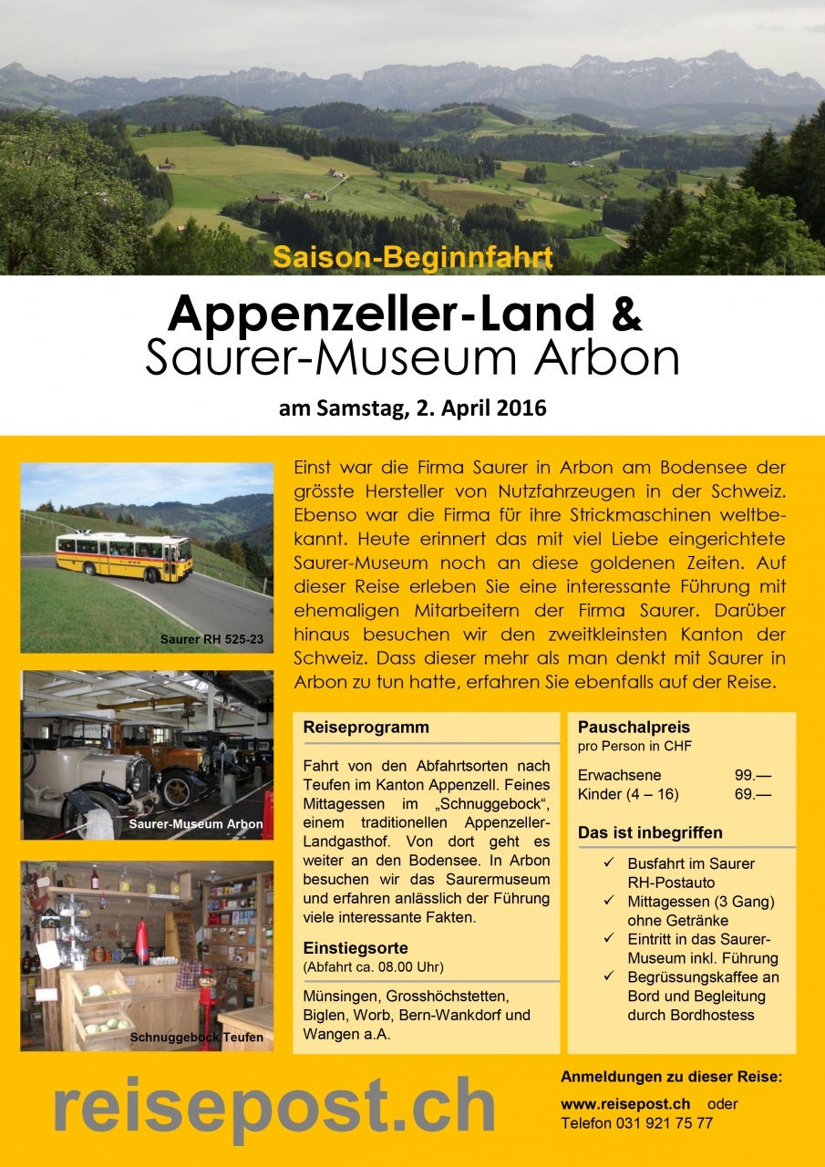 Sie fahren im historischen Saurer-Postauto ins Appenzellerland. Dort geniessen Sie ein wunderbares Mittagessen im Restaurant "Schnuggebock" oberhalb von Teufen. Am Nachmittag fahren wir an den Bodensee nach Arbon. Hier erwarten uns zwei ehemalige Angestellte der traditionellen Firma Saurer und führen uns durch das Museum. Sie erfahren mehr über die Lastwagen- und Busproduktion und sehen die ersten Saurer-Stickmaschinen, die auf der ganzen Welt berühmt wurden. Um viele Eindrücke reicher reisen wir anschliessend wieder zurück an die Ausgangsorte.