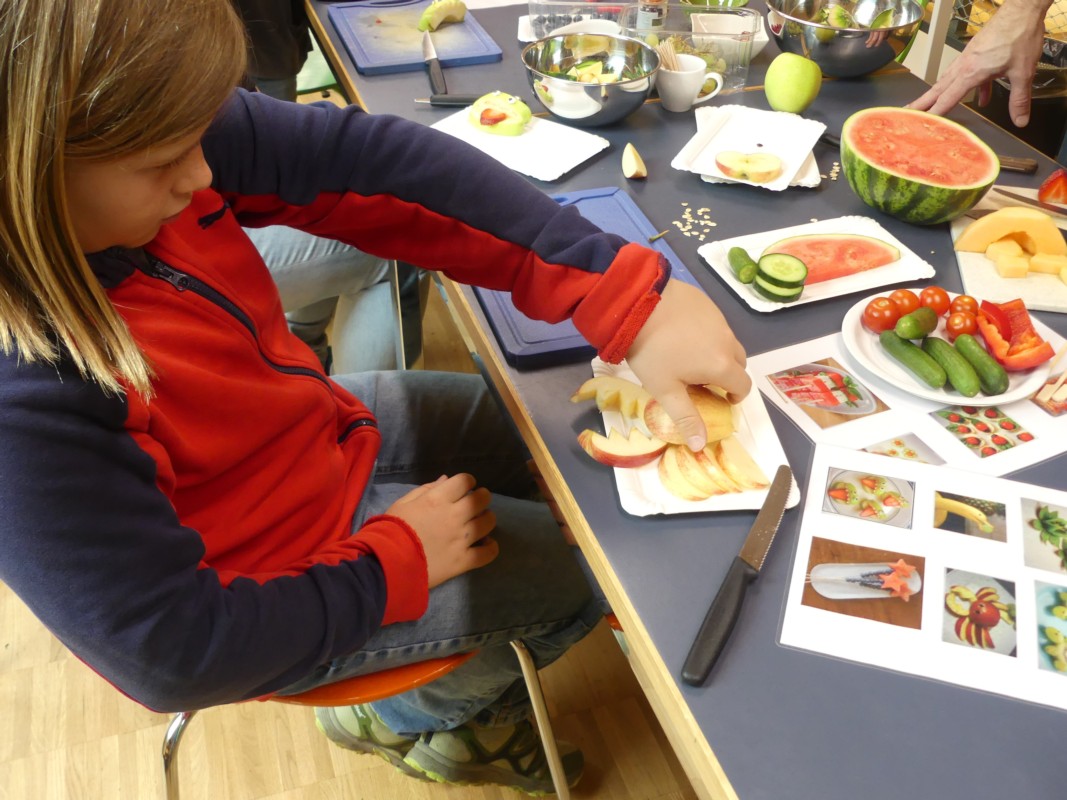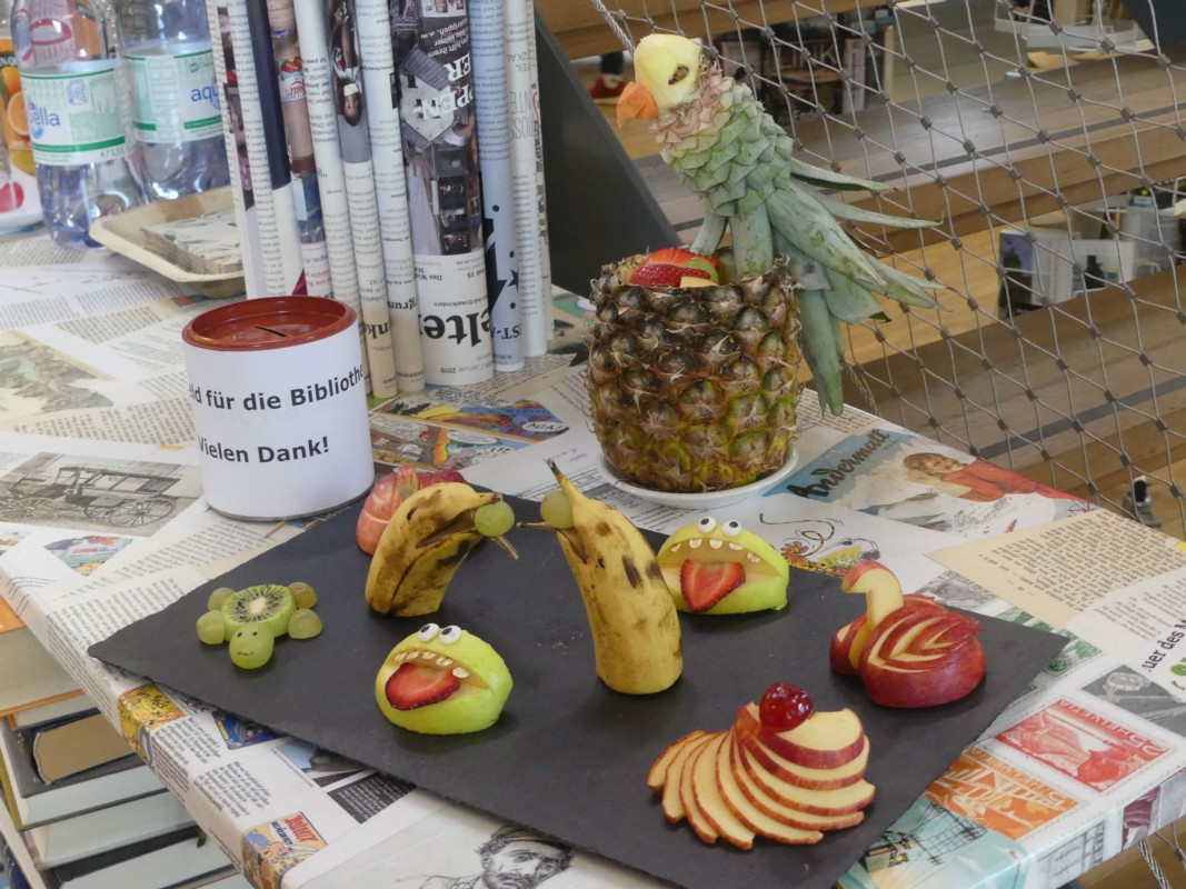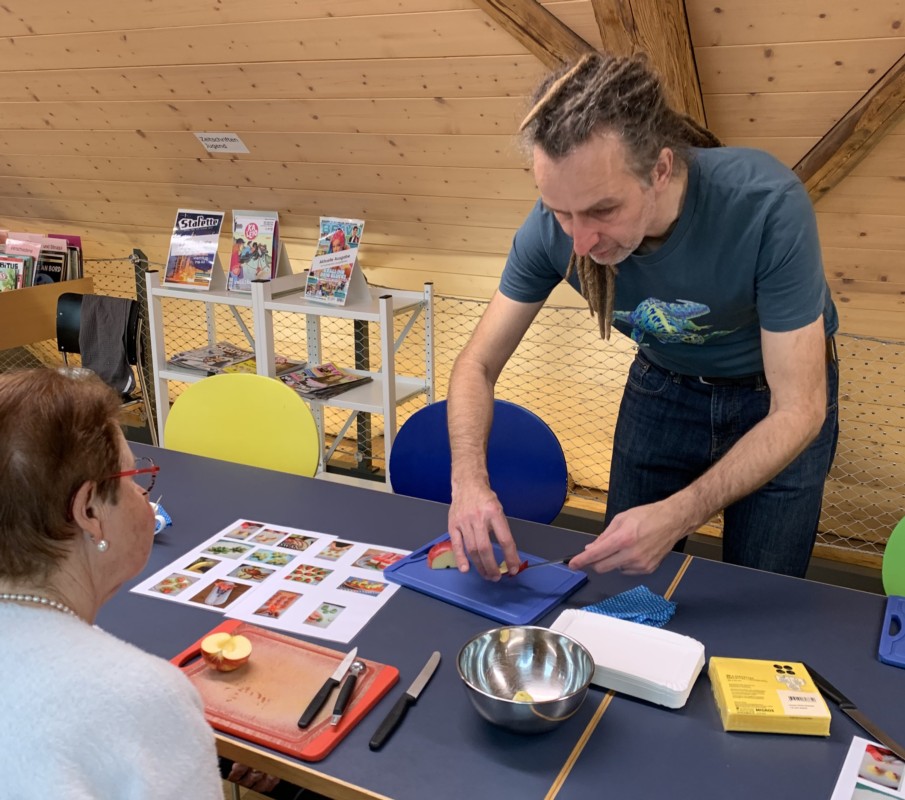 Stefan Biedermann, der Mitarbeiter in der Bibliothek Konolfingen, zeigte wie zum Teil ganz einfach Früchte und Gemüse in attraktive Dekorationen verwandelt werden können. Er habe selber aus Büchern und aus dem Internet versucht, solche Dekorationen zu machen, erklärte er. Das Angebot motivierte Klein und Gross zum Mitmachen. "Äs fägt, mi cha d'Abräschte sogar säuber ässe", meinte ein Junge. Ob aus Gurken, Tomaten, Bananen oder Ananas, beim Bearbeiten wird neben der Handfertigkeit auch die Kreativität gefördert. Die vorgängig feinen Dekorationen gabs dann am Samstagabend auch zum Apéro.