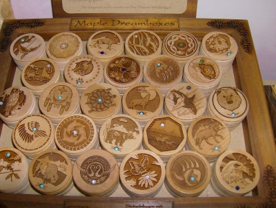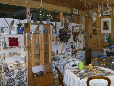 Alles ist indianisch im Indianerladen: Traumfänger, Traumbox, Kraftsteine, Hals-, Ohr- und Haarschmuck, Arm- und Haarspangen, Federbilder, Filzbilder mit Sternzeichen in den Farben des indianischen Medizinrades, Tonträger mit indianischer Musik.