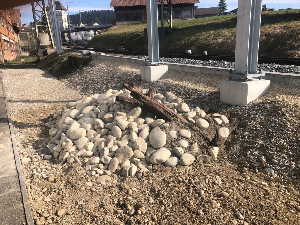 Damit sich die Eidechsen am Morgen auf einer dunklen Fläche rasch aufwärmen können, wurde bei jedem Steinriegelbiotop ein Holzstück eingebaut. Auch Insekten sollen darin Nahrung und Nistmöglichkeiten finden. Zum Erstaunen und zum Ärgernis der Gartenbauer ist ein grosses Stück Holz allerdings bereits nach wenigen Tagen entwendet worden. "Es war ein sehr schönes Stück Quittenholz aus einem Kundengarten." Ums Geld gehe es ihm dabei nicht. "Ich habe auf meinem Hof viel Holz und könnte gut ein neues Stück bringen."