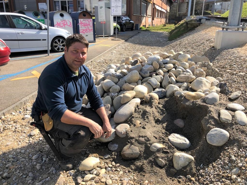 Vor rund zwei Wochen legte er mit einem seiner Gärtner am Bahnhof Biglen vis-à-vis des Einkaufscenters Coop einen Trockenstandort mit drei Steinriegelbiotopen an. Auf der Kiesfläche sollen dank Wildblumen und Steinunterschlüpfen bald Wildbienen, Insekten und Eidechsen heimisch werden.