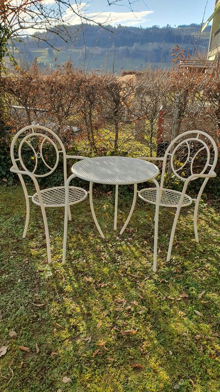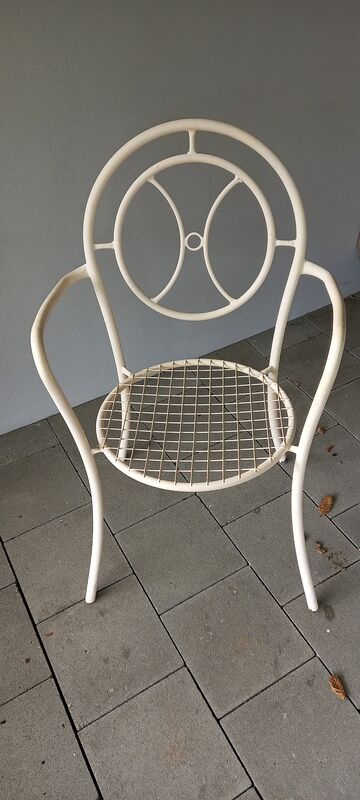 3 teiliges Bistro Set. Weiss Metall im Vintage Stil,  2 Stühle, 1 Tisch, Durchmesser 60cm.