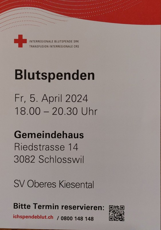 Am Freitag, 5. April, findet im Gemeindehaus Schlosswil unser nächster Blutspende-Anlass statt. Ab 18.00 Uhr sind wir bereit. Für diesen Freitag sind wir genug Helfer. Aber an den nächsten Anlässen wären wir froh um 1-2 kräftige Personen, die uns beim Aufbau (ca. 16.30 Uhr) und Abbau (ab 20.30 Uhr) unterstützen. Melde dich bei uns, falls du Zeit hast.