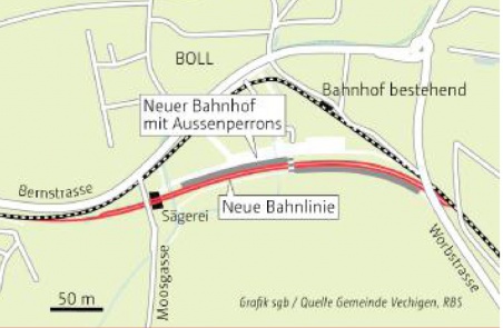 Anders als ursprünglich vorgesehen, verzichtet der RBS nun auch darauf, das zweite Gleis im neuen Bahnhof als Doppelspur noch ein Stück weit in Richtung Bern zu verlängern. In zwei weiteren Punkten dagegen bleibt alles beim Alten: Die Moosgasse unterquert die Bahn durch eine Unterführung, und die Halle der Sägerei Brand muss dem neuen Trassee weichen.