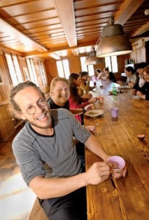 Die Geschichte um das Baugesuch ist typisch für die Art und Weise, wie die Jumi AG funktioniert. In deren Alltag spielen der Hang zum Ungeordneten und das Vertrauen aufs Bauchgefühl eine grosse Rolle. Auch beim Mittagessen gehts jeweils laut zu und her. Am langen Holztisch haben an diesem Tag rund 30 Leute Platz genommen. Es riecht nach Rosmarin und Käse, wobei der Käsegeruch nicht vom Mittagessen kommt. Überall sind Käse in unterschiedlicher Form und Farbe zu entdecken, manche abgepackt, andere reifen im Keller vor sich hin. Mike Glauser schöpft Risotto auf den Teller. «Wir sind eine grosse Familie aus Freaks. Jeder hat seine Eigenheiten.»