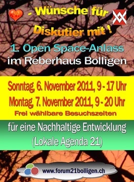 Am 6. und 7. November findet im Reberhaus der 1. Open-Space-Anlass für Bolligen statt. Thema ist der Stand der nachhaltigen Entwicklung in der Gemeinde und im Kanton Bern.