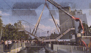 «Heute ist ein schöner Tag für Bolligen», sagte Gemeindepräsident Rudolf Burger (parteilos). Und schnitt feierlich die rote Schleife durch, welche den Weg auf die andere Seite der Worble (noch) versperrte. Dann schritt er feierlich mit Nationalrätin Margret Kiener Nellen (SP) über den Steg. Die zahlreich erschienenen Bolliger applaudierten. Die Gemeinde weihte gestern Abend den sanierten Verkehrsknoten Station Bolligen ein (wir berichteten). Als Hauptattraktion des Einweihungsakts wurde das Kunstprojekt «Der vierte Steg» mit einem Kran über die Worble gelegt. Der Steg des Künstlerpaares Sabina Lang und Daniel Baumann führt, statt direkt über den renaturierten Bach, zuerst einige Tritte hinunter und anschliessend wieder nach oben. Bei Hochwasser wird die Worble dem Fussgänger auf dem Steg wohl gefährlich nahe kommen.