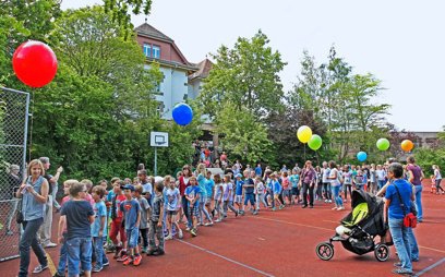 Schüler und Lehrer des Flugbrunnenschulhauses verabschiedeten sich gestern von ihrem Schulort. Sie zogen zum Lutertalschulhaus, wo sie herzlich empfangen wurden.