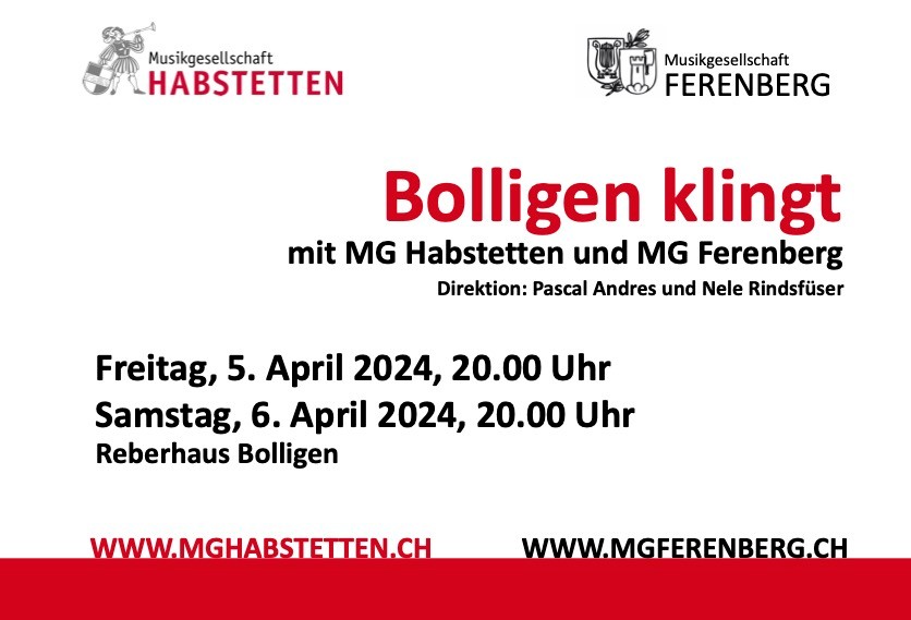 Die Musikgesellschaften Ferenberg und Habstetten freuen sich, Sie zu unserem Gemeinschaftskonzert «Bolligen klingt» einzuladen und Sie am Freitag, 5. und Samstag, 6. April 2024 im Reberhaus Bolligen willkommen zu heissen.