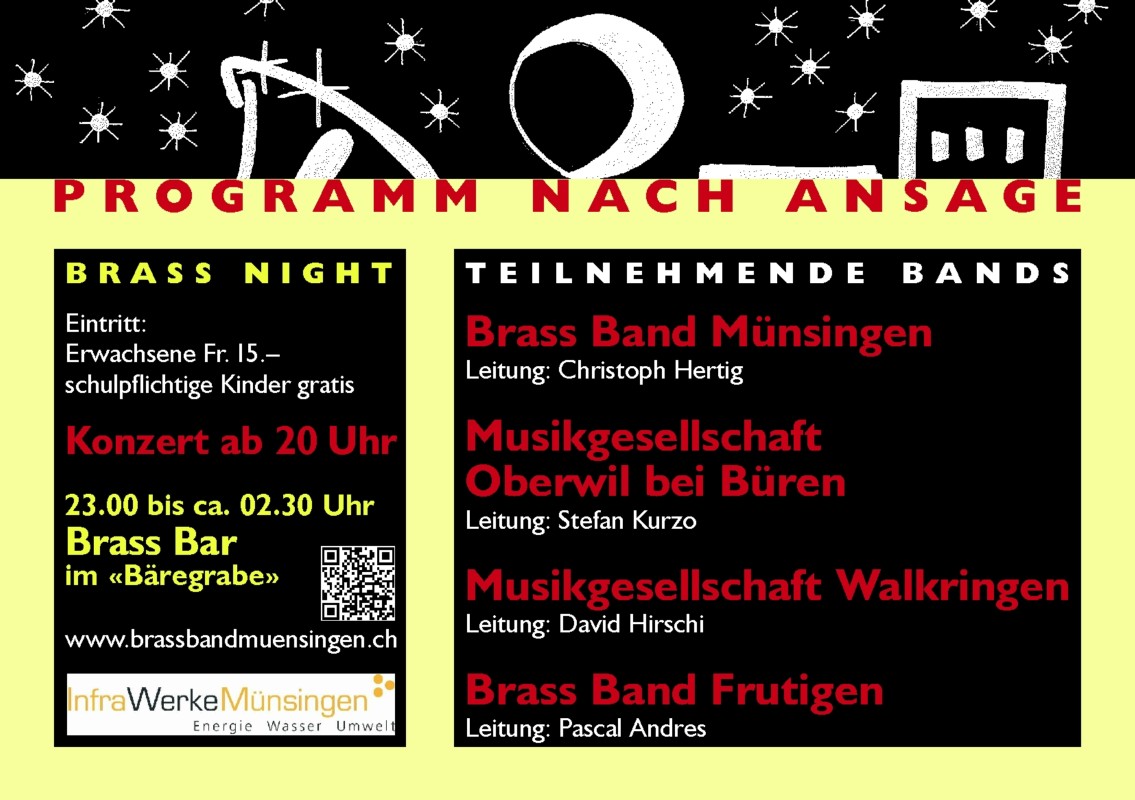 Bereits zum neunten Mal findet in Münsingen die Brass Night statt. Vier Brass Bands aus verschiedenen Stärkeklassen präsentieren sich in je einem Block mit Unterhaltungsmusik dem Publikum.