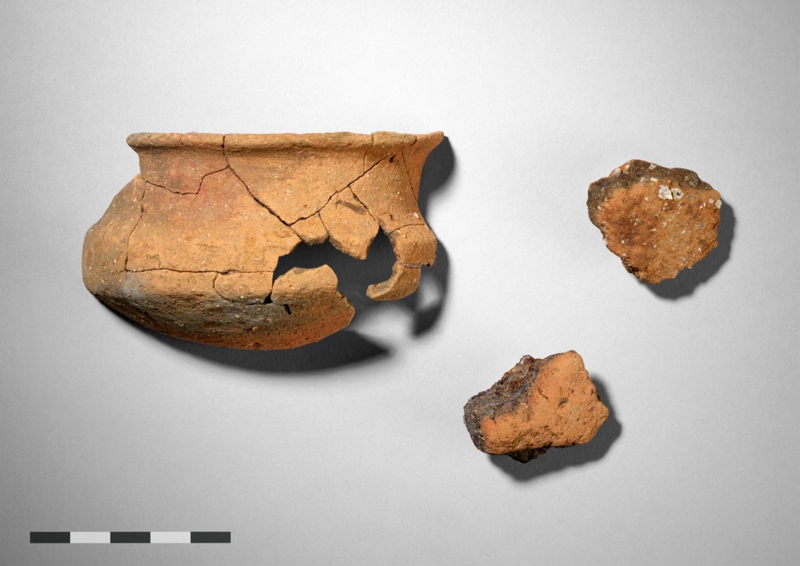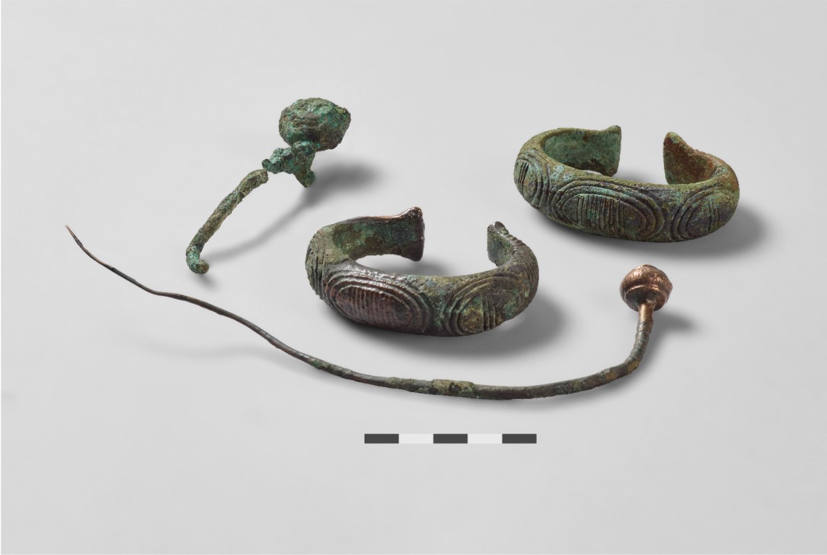 Das Grabungsteam fand zwei Gruben mit flacher Sohle. Während die eine Grube keine Funde aufwies, enthielt die andere Holzkohle und zahlreiche kleine Fragmente verbrannter Knochen. Darauf lagen ein Bronzearmring, ein stark verbranntes Bronzeobjekt, Reste einer zerbrochenen Schüssel sowie die Scherbe eines grösseren Gefässes. Im Sediment darüber befand sich ein grosser Sandsteinblock.