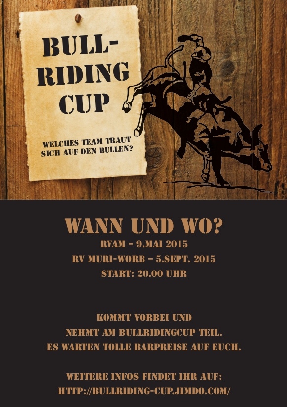 Am Samstag 09. Mai ab 20:00 Uhr steigt auf dem Reitplatz Schützerüti die grosse Bullriding Party! Kommt vorbei und nehmt an der ersten Station des diesjährig neu ins Leben gerufenen Bullriding-Cups teil. Anmeldung für die Bullriding Teilnahme direkt auf Platz (Startgeld 10.- pro 2er-Team), alle sind herzlich willkommen. Wichtige Infos zum Bullriding-Cup entnehmt Ihr dem Flyer oder der Homepage http://bullriding-cup.jimdo.com. Dazu Barbetrieb mit guter Musik von DJ Bernd. Der Reitverein Aaretal-Münsingen freut sich auf viele Gäste!