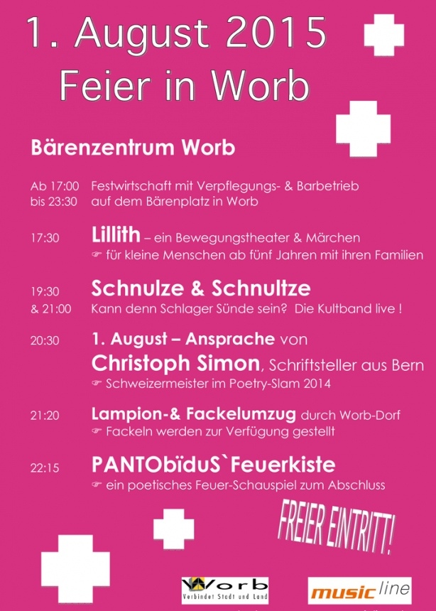Für die in Worb traditionell etwas andere 1. August - Rede konnte der aktuelle Schweizermeister im Poetry-Slam gewonnen werden: Christoph Simon, Berner Schriftsteller und Autor, wird sich um 20.30 Uhr mit seinen Worten zur Lage der Nation an die Worber Bevölkerung wenden und vermutlich für viele Lacher sorgen. Später am Abend findet dann der Lampion- und Fackelumzug statt und danach ein Feuerschauspiel aus "PANTObïduS`Feuerkiste"
