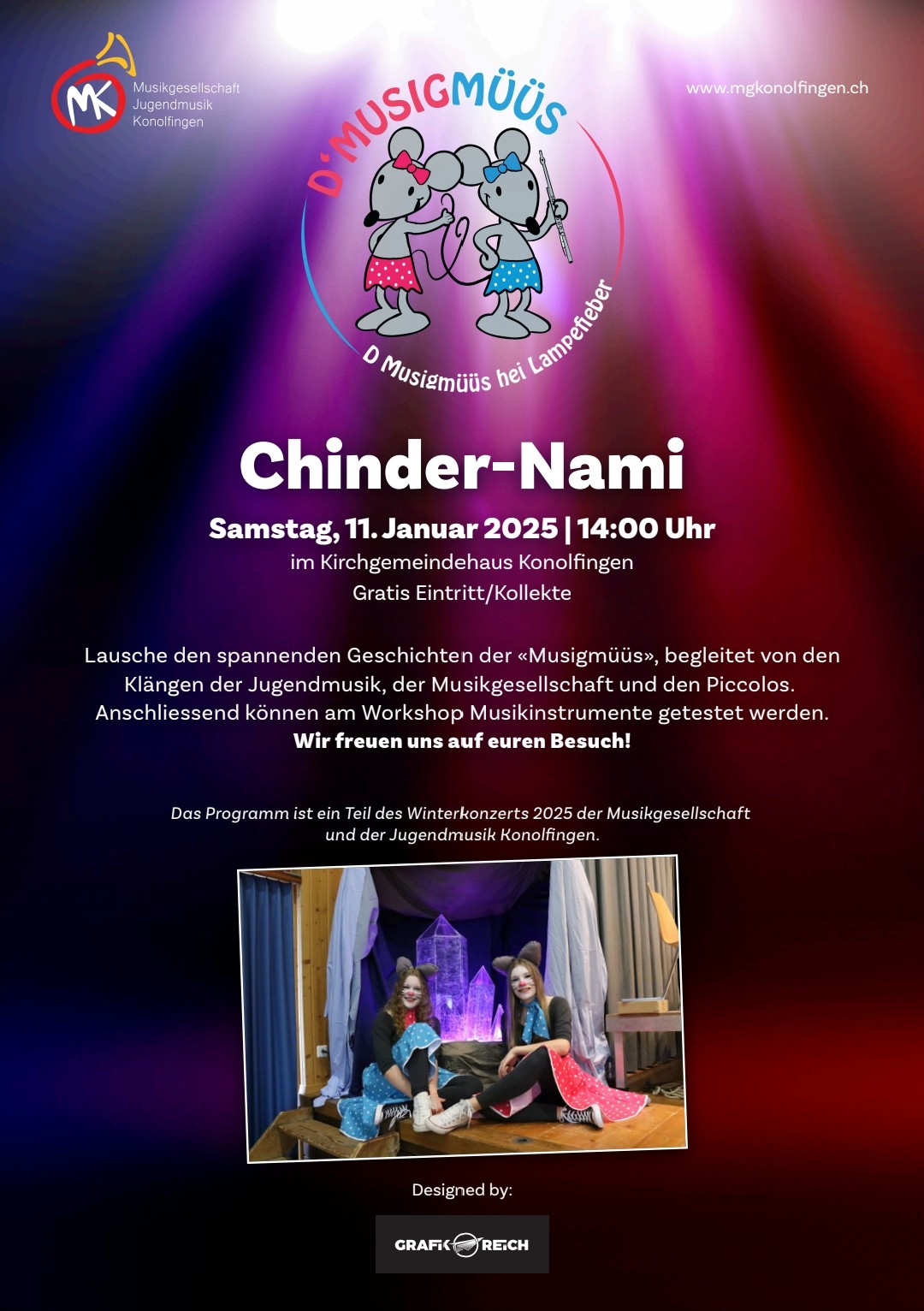Lausche den spannenden Geschichten der Musigmüüs, begleitet von den Klängen der Jugendmusik und Musikgesellschaft Konolfingen, sowie den Piccolos. Anschliessend können am Workshop Musikinstrumente getestet werden.