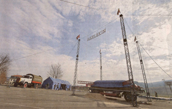 «Dies ist der wichtigste Teil», sagt Peter Pichler, der Chef und Clown des Zirkus. «Der Zeltmeister musste vorab alles haargenau abmessen und markieren. Wenn die Markierungen für die Seile und Masten nicht stimmen, kann das Zeltdach nicht aufgesetzt werden», fährt er fort. Nachdem die vier Zeltmasten in den richtigen Positionen sind, sollte eigentlich das Zelt aufgezogen werden.