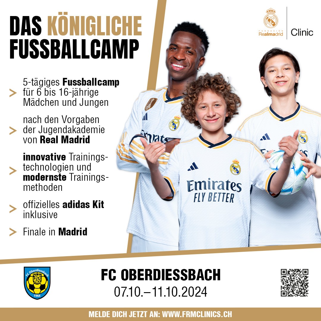 In den Herbstferien, vom 7.10. – 11.10.2024, gastiert die Fundación Real Madrid Clinic mit ihrem Fussballcamp erstmalig in Oberdiessbach und führt ein 5-tägiges Trainingslager für Jungen und Mädchen zwischen 6 und 16 Jahren durch.