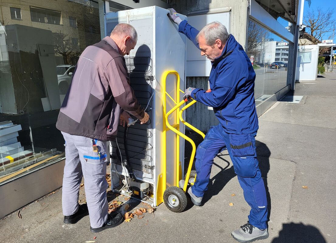 Sobald der Umzug aktuell wurde, bekam ich schnell das Angebot, das Technikteam der Altersbetreuung – Hanspeter Hirsiger und sein Nachfolger Hans Peter Locher – könne den kurzen Umzug durchführen. Der neue Standort des Kühlschranks befindet sich von der Strasse vor dem Alterszentrum her gesehen ganz rechts hinten*, unter dem Dach des Veloständers. Ab jetzt ist der Kühlschrank grösstenteils vor Sonneneinstrahlung und vor allem komplett vor dem Regen geschützt. Ein toller Standort!