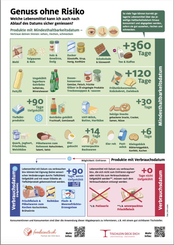 Auf der Liste, die im Inneren des Kühlschranks angebracht ist, stehen detaillierte Informationen: Alle Lebensmittel mit dem Vermerkt «Mindestens haltbar bis» sind über das Datum hinaus in Ordnung und geniessbar. Wieviel es leiden kann, steht ebenfalls auf der Liste. Lebensmittel, die den Vermerk «zu verbrauchen bis …» tragen, dürfen jedoch nach diesem Datum nicht mehr im Kühlschrank deponiert werden. Und aus Sicherheitsgründen sind weder Fleisch noch Alkohol erlaubt.
