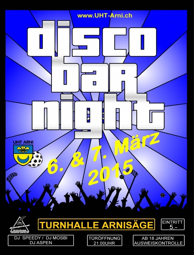 Auch dieses Jahr veranstaltet das Unihockeyteam Arni die legendäre Disco & Bar Night. Am Wochenende des 6. und 7. März 2015 freuen wir uns auf deinen Besuch in der Turnhalle Arnisäge. Türöffnung ist jeweils um 21:00 Uhr.