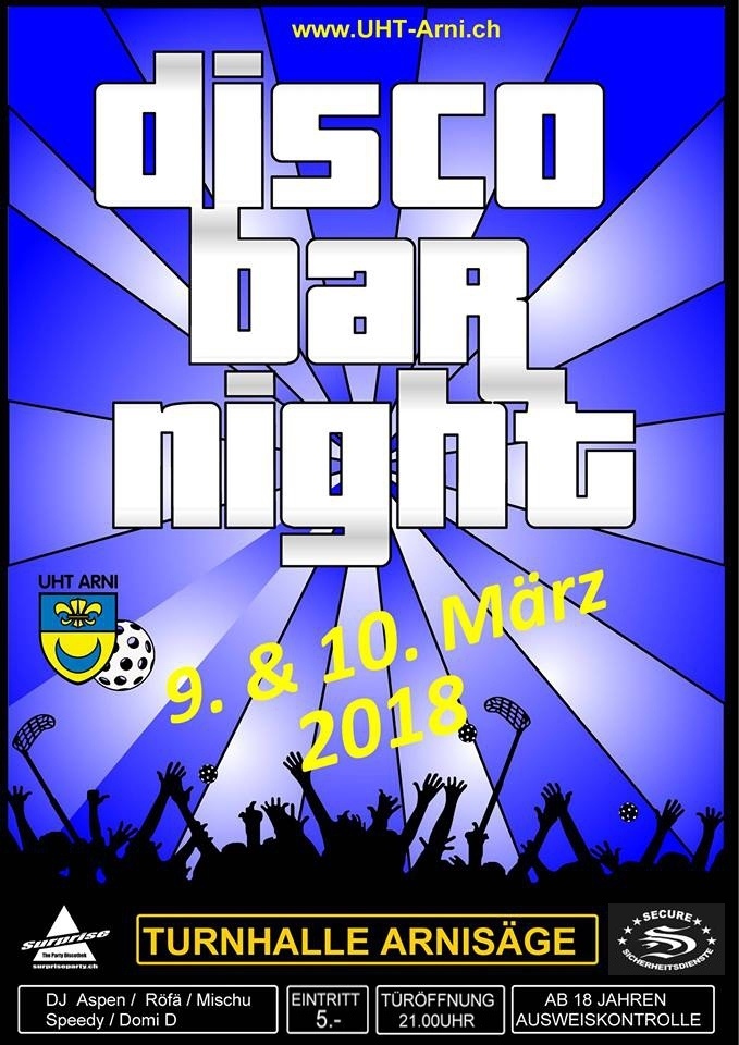 Am Wochenende des 9. und 10. März 2018 freuen wir uns auf deinen Besuch in der Turnhalle Arnisäge. Türöffnung ist jeweils um 21:00 Uhr.