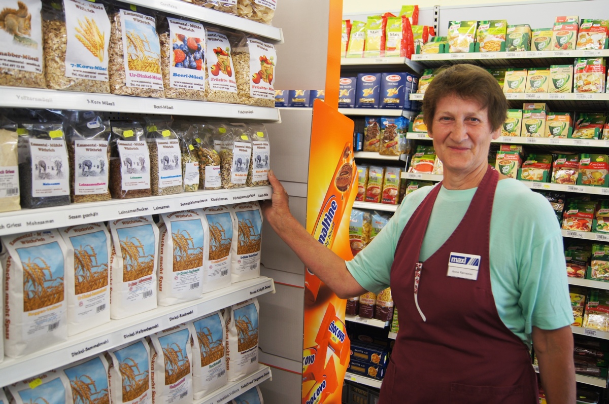 Von Müdigkeit ist wenige Stunden später in der Dorf-Chäsi jedoch nichts spürbar. Esther Bärtschi, die aufgrund der Ferienabwesenheit von Christine Fink den Frühdienst heute übernommen hat, und Anna Ramseier sind damit beschäftigt, Joghurt, Mehl und andere Produkte in den Regalen einzuräumen. In regelmässigen Abständen klingelt die Ladenglocke und eine der beiden wechselt zur Kasse oder hinter die Käse-Theke, um Kunden zu bedienen.