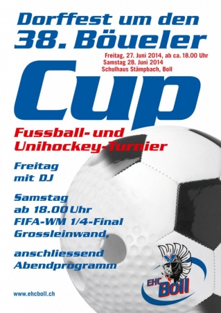 27.06.2014 bis 28.06.2014 Unser traditioneller Böueler Cup findet dieses Jahr am 27. - 28. Juni 2014 im Stämpbach Schulhaus in Boll statt. Nebst dem Fussball- und dem Unihockey-Turnier bietet der Böueler Cup zahlreiche weitere Attraktivitäten wie die Festwirtschaft, eine Bierschwemme, sowie für die Jüngsten eine Hüpfburg.