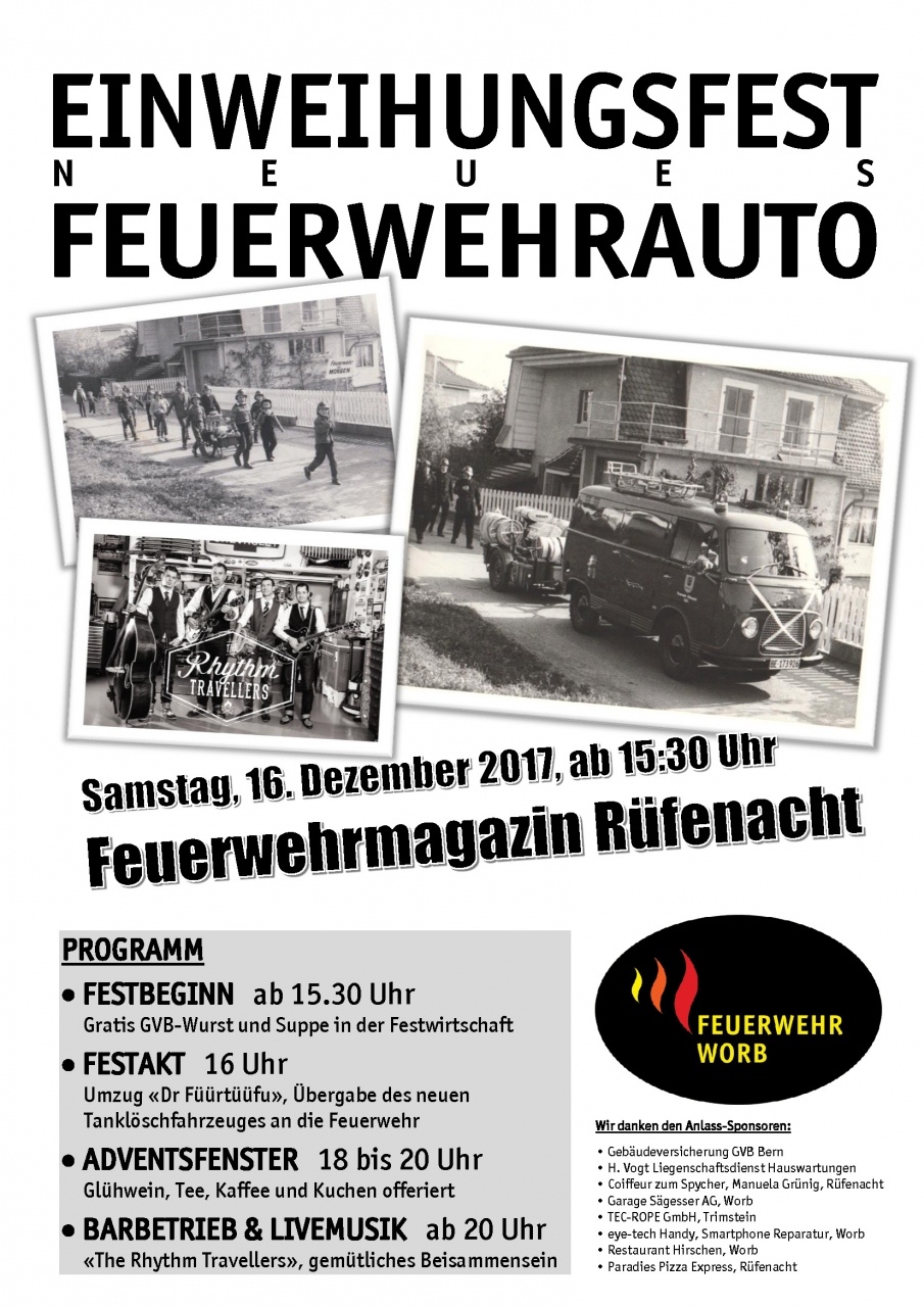 - 1600 Uhr, Festakt mit Umzug "Dr Füürtüüfu" und Übergabe neues Tanklöschfahrzeug an die Feuerwehr Worb