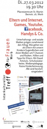 Unterhaltungs- und soziale Medien prägen zunehmend den Alltag. Wie gehen wir als Eltern mit unsern Kindern/Jugendlichen und ihren Medien um? Chancen und Risiken, Hilfen und Tipps für Eltern. Mit David Amstutz, Schulsozialarbeiter und Medienpädagoge. Der Interkulturelle Treffpunkt für Frauen Worb lädt Eltern und Interessierte ganz herzlich ein.