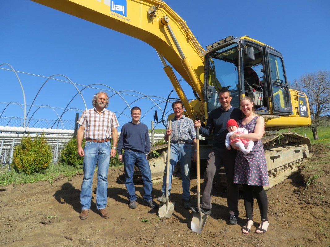 Am Donnerstag war der Spatenstich. Anwesend waren nebst drei Generationen der Familie Schürch auch Niklaus Bay, Geschäftsführer der Cäsar Bay AG und Remo Dobler, Ingenieur bei Schmalz Ingenieur AG in Konolfingen. Die Konolfinger Baufirma Cäsar Bay fuhr mit einem Bagger auf.