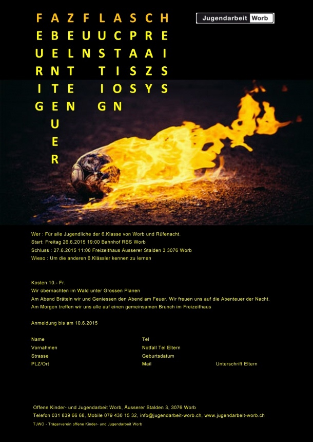 10.6.15 bei: Jugendarbeit Worb, Äusserer Stalden 3, 3076 Worb, info@jugendarbeit-worb.ch , 031 839 66 86