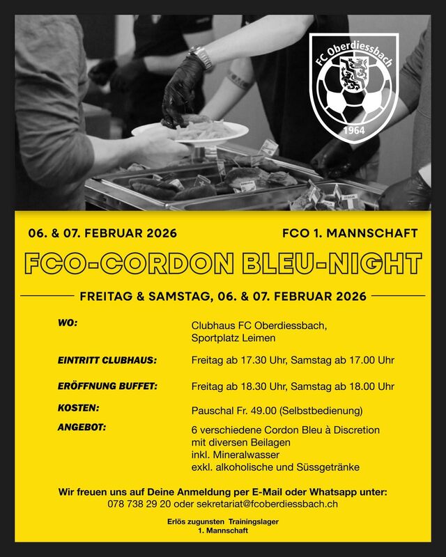Am 6. und 7. Februar lädt der FC Oberdiessbach zur traditionellen Cordon Bleu Night ins Clubhaus auf dem Sportplatz Leimen ein.