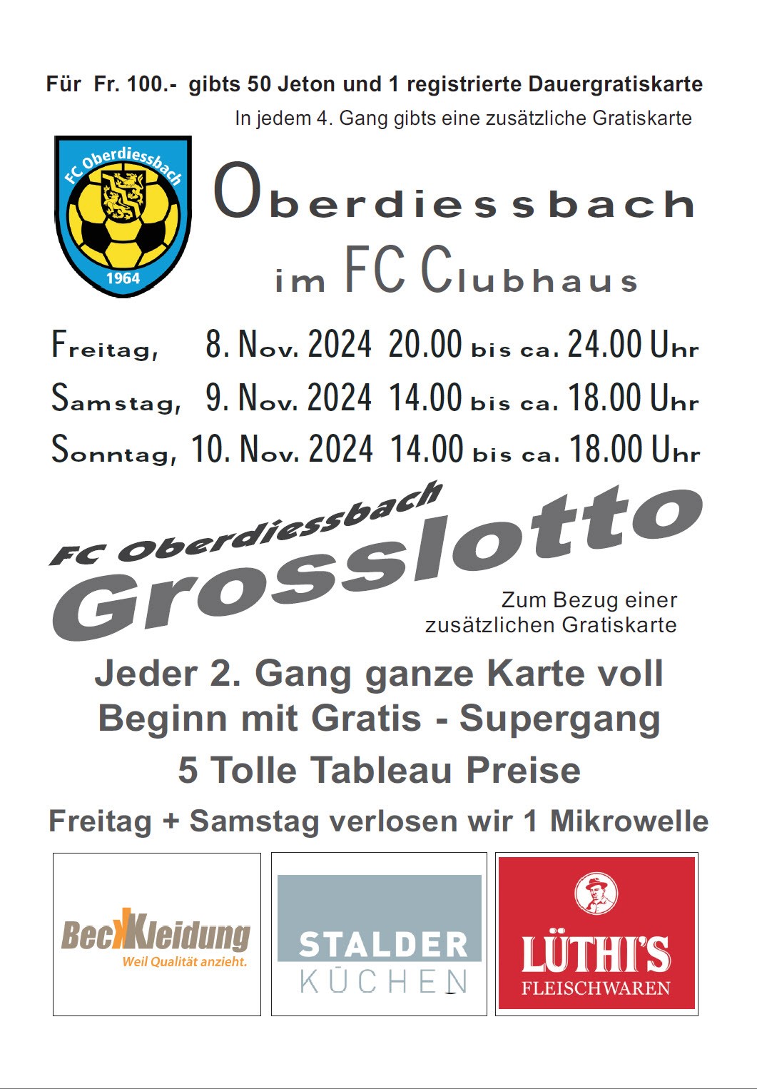 Der FC Oberdiessbach lädt ein zum Grosslotto im CLubhaus auf dem Sportplatz Leimen.